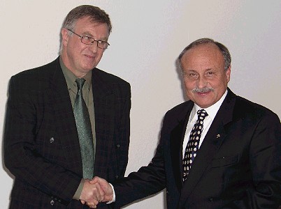 Der Neue ist zugleich der Dienstälteste Rudolf Link (l.) überreicht Karl Braun das Ernennungsschreiben. (Foto:Peters)(hr) (ap) Die "Schule für Kranke in längerer Krankenhausbehandlung", kurz Klinikschule, am Schwarzacher Hof der Johannes-Anstalten Mosbach steht unter neuer Leitung. Der "Neue" in der Schulleitung ist jedoch zugleich der Dienstälteste: Karl Braun hat bereits 1975 als Sonderschullehrer seinen Dienst dort aufgenommen, und seither ist der Eberbacher "seiner" Schule treu geblieben.