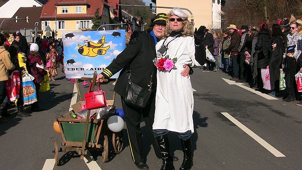 Außer den Kuckucken waren aus Eberbach die KG Urmel und der Club Eulenspiegel mit mehreren Gruppen vertreten, außerdem die Hirschhorner Ritter und die Neckargemünder Karnevalgesellschaft. Neben privaten Gruppen, Kindergärten und Vereinen aus Eberbach kamen Teilnehmer aus Friedrichsdorf/Kailbach, Hirschhorn, Igelsbach, Neckarsteinach und Waldbrunn. Viele Gruppen waren auch aus Sensbachtal gekommen, wo die Fastnacht von den Vereinen TSV und MGV organisiert wird. Wieder einen besonders aufwändig gestalteten Motivwagen, diesmal zum Thema Pippi Langstrumpf, hatten die Karnevalfreunde Haidebow dabei (Bild rechts oben). Damit belegten sie bei der diesjährigen Wagenprämierung in Mudau den ersten Platz. Zweitplatzierte waren die "Wilden aus dem Ittertal", die heute ebenfalls in Eberbach dabei waren und als Gartenzwerge ein buntes Bild abgaben. Fantasievolle Fußgruppen waren unter anderem die "Wimmersbacher Ratze" (Schneewittchen) und die "Rasselbande" (Eskimos).