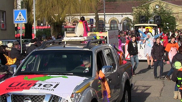 Außer den Kuckucken waren aus Eberbach die KG Urmel und der Club Eulenspiegel mit mehreren Gruppen vertreten, außerdem die Hirschhorner Ritter und die Neckargemünder Karnevalgesellschaft. Neben privaten Gruppen, Kindergärten und Vereinen aus Eberbach kamen Teilnehmer aus Friedrichsdorf/Kailbach, Hirschhorn, Igelsbach, Neckarsteinach und Waldbrunn. Viele Gruppen waren auch aus Sensbachtal gekommen, wo die Fastnacht von den Vereinen TSV und MGV organisiert wird. Wieder einen besonders aufwändig gestalteten Motivwagen, diesmal zum Thema Pippi Langstrumpf, hatten die Karnevalfreunde Haidebow dabei (Bild rechts oben). Damit belegten sie bei der diesjährigen Wagenprämierung in Mudau den ersten Platz. Zweitplatzierte waren die "Wilden aus dem Ittertal", die heute ebenfalls in Eberbach dabei waren und als Gartenzwerge ein buntes Bild abgaben. Fantasievolle Fußgruppen waren unter anderem die "Wimmersbacher Ratze" (Schneewittchen) und die "Rasselbande" (Eskimos).