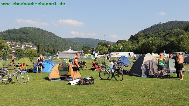 An die 2.000 Teilnehmer der Tour waren am Vormittag in Weinheim gestartet. Trotz sommerlicher Hitze mit Temperaturen von mehr als 35 Grad kamen die meisten Radler nach einer letzten gemeinsamen Pause in Mossbrunn gegen Abend wohlbehalten in Eberbach an. Mit Applaus wurden sie am Radweg im Sportgebiet in der Au empfangen. Dort warteten auf sie zunächst Erfrischungen in Form einer Wasserspritzanlage der Freiwilligen Feuerwehr und kühlenden Wasserschwämmen. Frischmachen konnten sich die Sportler auch in einem eigens zum Duschen aufgestellten "Showertruck". Zusammen mit den Tourveranstaltern des Südwestrundfunks und der EnBW hatten die Eberbacher unter Federführung des Kulturamts ein großes Fest vorbereitet. Am Nachmittag spielte die Musikkapelle "Kleiner Odenwald" aus Allemühl, und gegen Abend zog Jongleur "Jeremy" Klein und Groß in seinen Bann. Die eigentliche Etappenparty startete um 19 Uhr mit den Bands "Schlagerfeld" und der "Spider Murphy Gang" auf der großen Showbühne, vor der ein riesiger runder Pavillon aufgebaut war. Um 22 Uhr war schon wieder Schluss, nachdem die Stars aus Bayern mit Hits wie "Skandal im Sperrbezirk" für ausgelassene Stimmung gesorgt hatten. Denn die Radler brauchten ihren Schlaf für die nächsten Etappen, die an insgesamt sieben Tagen von Weinheim bis Stockach am Bodensee führen. Heute Morgen machten sich die Radler nach dem Frühstück auf in Richtung Bad Mergentheim. Übernachtet hatten viele von ihnen im Matratzenlager der Hohenstaufen-Sporthalle, wo 500 Schlafplätze vorbereitet waren, oder in Zelten auf dem Rasendreieck neben dem Fußballstadion. Einige Teilnehmer waren auch in umliegenden Hotels untergebracht, wofür Shuttlebusse eingesetzt waren.