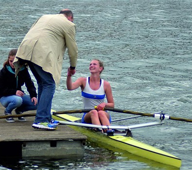 Zwölf Siege für Rudergesellschaft im Mannheimer Hafen Lisa Baumbusch am Siegersteg. (Foto: privat)(bro) (tg) Am vergangenen Wochenende fand die erste Ruder-Regatta der Saison 2014 über die Normaldistanz im Mannheimer Mühlauhafen statt. Die Rennmannschaft der RG Eberbach startete hier erfolgreich in die Saison und kehrte mit zwölf Siegen nach Hause zurück. Bei dieser Regatta starteten Ruderinnen und Ruderer aus dem gesamten süddeutschen Raum. Vom Bodensee bis Kassel und von Saarbrücken bis Passau erstreckte sich das Einzugsgebiet dieser ersten Standortbestimmung.