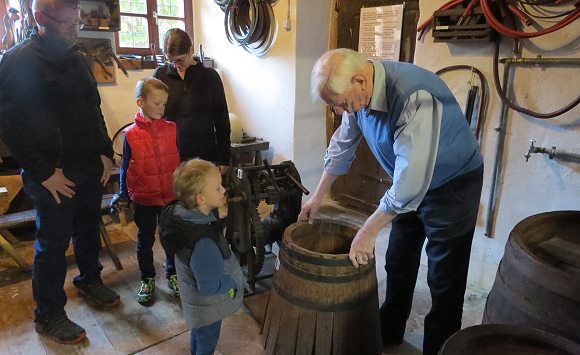 Helm und seine Frau hatten am Apfeltagsonntag ihr Museum, wie immer bei freiem Eintritt, geöffnet und hatten regen Besuch. Einheimische und Gäste ließen sich von dem Ehepaar die Werkstatt mit all ihren Maschinen und historischen Gegenständen sowie die Entstehung eines Holzfasses zeigen und erklären.