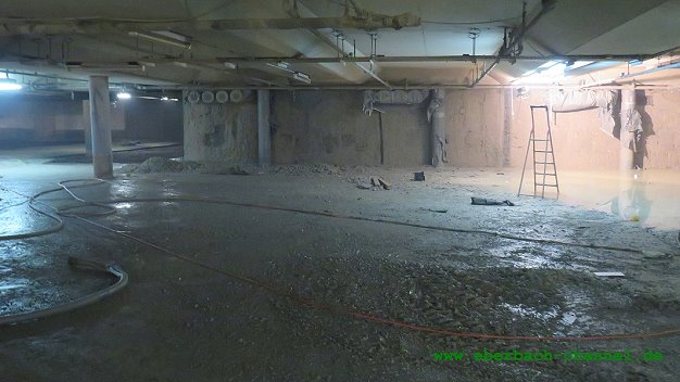 Im März gab die Verwaltung in einer öffentlichen Gemeinderatssitzung bekannt, dass bei den Strahlarbeiten mit einem Hochdruckgerät die Betondecken löchrig und instabil geworden seien, weshalb in Einzelabschnitten eingeschalt und aufbetoniert werden müsse. Aktuell ist die Tiefgarage kaum wiederzuerkennen (siehe Fotos). Jede Menge Stahlsprieße sind für die Deckenabstützungen im Einsatz, Belüftungs- und Wasserabsaugeinrichtungen sind in Betrieb, die komplette Technik wurde abgebaut oder provisorisch abgehängt, um die Betondecken zugänglich zu machen. Das bei den Strahlarbeiten verwendete Wasser wird abgesaugt und oberirdisch maschinell gereinigt, bevor es in die Kanalisation kommt. Bauschutt wird mit Radladern aus den unterirdischen Geschossen gefahren und entsorgt. Manfred Schüssler vom Eberbacher Stadtbauamt lobt die Arbeitsausführung durch die beauftragte Firma AZ Bautenschutz aus Ludwigsburg, die auch samstags arbeite. Man liege aktuell etwa vier Wochen hinter dem geplanten Zeitfenster, so Schüssler. In vier Bauabschnitten werden Teile der Betondecken im ersten Untergeschoss teils unter Einsatz einer leistungsstarken Hochdruck-Schneidemaschine ausgeschnitten, neu verschalt, mit frischem Stahl bewehrt und betoniert. Um die Stabilität des kompletten Bauwerks zu gewährleisten, mussten nach Berechnungen eines Statikers Verstärkungen und Abstützungen eingebaut werden. Um eine erneute Schädigung des Betons in den kommenden Jahren zu verhindern, soll eine Schutzschicht aufgebracht werden. Außerdem werden neue farbliche Fahrbahnmarkierungen und Parkplatzeinteilungen vorgenommen.