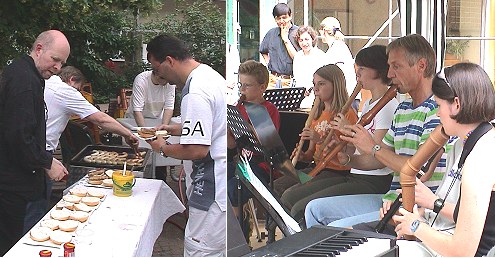 Musikschule präsentierte sich (Fotos:Richter)(hr) Einen Querschnitt durch ihr Ausbildungsprogramm präsentierte die Musikschule Eberbach vorgestern beim Musikschultag auf dem Lindenplatz. Schülerinnen, Schüler und Ensembles musizierten ab 10.30 Uhr bis zum Nachmittag. Unser Bild rechts zeigt das Blockflötenensemble. Lehrkräfte der Musikschule und Eltern sorgten für die Bewirtung der Gäste (Bild links).