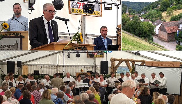 Vor 750 Jahren erstmals urkundlich erwĂ€hnt Oben v.l. Ortsvorsteher Robin Seib, Stadtarchivar Dr. Marius Golgath und Peter Layer, unten der gemischte Chor Brombach beim Liedvortrag. (Fotos: Hubert Richter)(hr) Im Eberbacher Ortsteil Brombach steht dieses Wochenende ganz im Zeichen des 750-jĂ€hrigen DorfjubilĂ€ums. Im Rahmen des Festwochenendes wurde heute im Festzelt am Schützenhaus zum Festakt geladen.