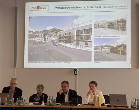 Im Zuge der Aufstellung des vorhabenbezogenen Bebauungsplans „Wohnquartier Neckarstraße“ präsentierte der Immobilienentwickler “ProImmo” die Planungsentwürfe für den neuen Gebäudekomplex am Kreisverkehr. Im Untergeschoss ist eine Tiefgarage mit Fahrradstellplätzen vorgesehen. Das Erdgeschoss bietet gemeinschaftsorientierte Wohnlösungen und Gewerbeflächen. Das erste Obergeschoss ist zur kompletten Wohnnutzung geplant. Das zweite Obergeschoss bietet Wohnen mit Dachbegrünung, und im dritten Obergeschoss soll es nun ein verkleinertes Wohnkonzept geben. Die Fassaden sind auf Anregung des Bau- und Umweltauschusses nun mit Fenstern und einer Begrünung für die Wandfläche festgeschrieben. Es sollen mindestens 20, höchstens 26 Wohnungen entstehen. In dem Planungsentwurf hat der Vorhabenträger eine spezielle artenschutzrechtliche Prüfung durchgeführt und verpflichtet sich zur Durchführung sämtlicher Maßnahmen, dazu gehört die Umsiedelung sowie die dauerhafte Unterhaltung von mehreren Nistkästen für Höhlenbrüter und Nischenbrüter am Gebäude.