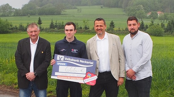 Bereits 81 Einsätze absolviert Christian Seibert (2.v.l.) von der "Helfer-vor-Ort"-Gruppe des DRK Waldbrunn übernahm vom Vorstand des VfR Waldkatzenbach, vertreten durch den 1. Vorsitzenden Uwe Bornmann (2.v.r.), den 2. Vorsitzenden Hansi Wagner (l.) und den 3. Vorsitzenden Tobias Springer (r.), einen Scheck über 666 Euro. (Foto: Jürgen Hofherr)(hof) (hof) Mit einem Ehrungsfrühschoppen feierte der VfR Waldkatzenbach dieser Tage im Festzelt auf dem Sportgelände am Fuße des Katzenbuckels sein 60-jähriges Bestehen.