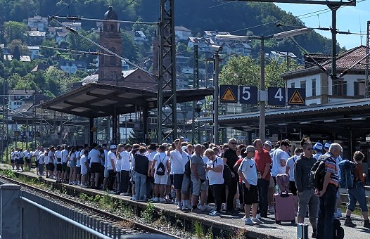 Die geballte Fußballanhängerschaft des Sinsheimer Vereins stieg am Eberbacher Bahnhof in den Zug nach Darmstadt um. Dort steht heute um 15.30 Uhr das Bundesligaspiel der Hoffenheimer gegen den SV Darmstadt 98 an.