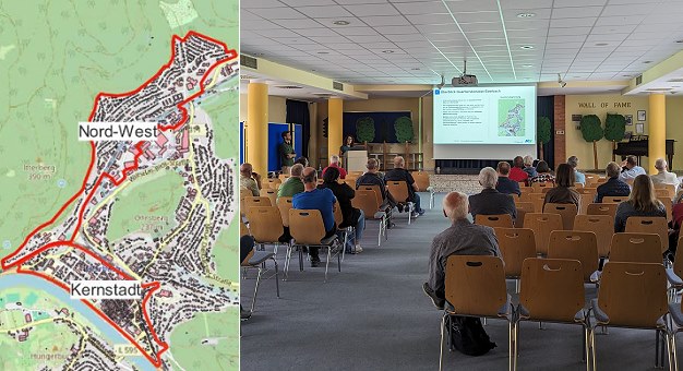 Auftakt in den Bereichen Kernstadt und Eberbach-Nord - Befragung läuft bis 12. Juni (Repro/Foto: Hubert Richter)(hr) Auf eher verhaltenes Interesse stieß die Auftaktveranstaltung zur Machbarkeitsprüfung von Nahwärmenetzen in Eberbach am Mittwochabend, 15. Mai, in der Aula der Steigeschule.