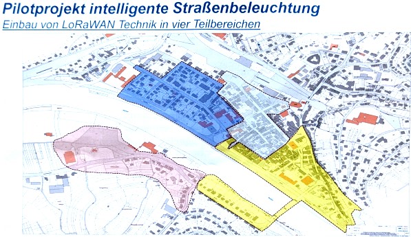 Gleichzeitig beauftragte der Gemeinderat am 27. Juni die Stadtwerke mit der technischen Umrüstung auf eine “intelligente Straßenbeleuchtung” als Pilotprojekt in vier Teilbereichen (Au, Neuer Markt/Beckstraße, Rathaus/Friedrich-Ebert-Straße und Altstadt/Bahnhofstraße, siehe Grafik). Dabei soll die so genannte “LoRaWAN”-Technik (wir berichteten) in die Straßenbeleuchtung integriert werden, um beispielsweise Teilbereiche gezielt schalten zu können, etwa bei Veranstaltungen wie dem Kuckucksmarkt oder bei Notfalleinsätzen. Matthias Hack von den Stadtwerken gab die Umrüstungskosten für das Pilotprojekt mit rund 16.000 Euro an und den jährlichen Betriebsaufwand mit rund 1.000 Euro. Wollte man die intelligente Straßenbeleuchtung in der ganzen Stadt umsetzen, wären dafür 40.000 Euro einmalig und jährlich etwa 6.000 Euro fällig.