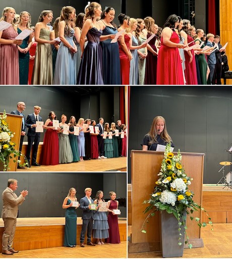 Die Verabschiedung wurde musikalisch umrahmt, einmal mit „Mamma Mia“ des Ensembles unter Leitung von Jutta Gewahl und mit zwei Stücken des Abi-Chors unter Leitung von Anja Kretzschmar.
