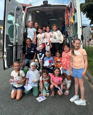 Ferienprogramm des DRK Ortsvereins Schönbrunn  (Foto: Gemeinde Schönbrunn)(bro) (gs) Am Freitag, 9. August, durften Kinder im Alter zwischen sieben und zwölf Jahren aus der Gemeinde Schönbrunn in die Welt der Ersten Hilfe eintauchen. Der DRK Ortsverein beteiligte sich auch dieses Jahr wieder am Ferienprogramm, diesmal mit Unterstützung der Kinder des Jugendrotkreuzes.