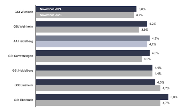 Arbeitslosigkeit im Bezirk Eberbach leicht verringert Die Arbeitslosigkeit im November nach Geschäftsstellen. (Quelle: Agentur für Arbeit) (bro) (aa) Die Arbeitslosigkeit im Bezirk Eberbach hat sich von Oktober auf November um sieben auf 486 Personen verringert. Die Arbeitslosenquote betrug im November 5,0 Prozent, vor einem Jahr belief sie sich auf 4,7 Prozent..