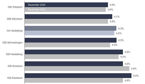Fast 500 Arbeitslose in Eberbach und nur gut 50 freie Stellen (Quelle: Agentur für Arbeit)(hr) (aa) In Eberbach registrierte die Agentur für Arbeit Heidelberg im Dezember 2024 die höchste Arbeitslosenquote unter den regionalen Geschäftsstellen.