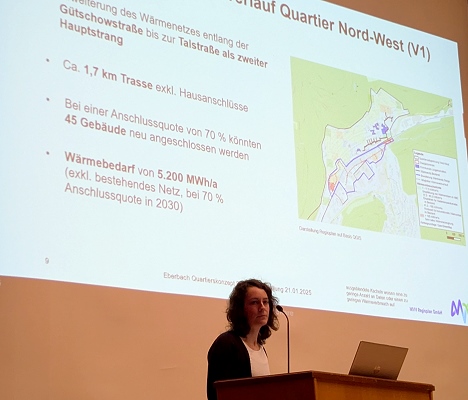 Konzept für nachhaltiges Heizen mit Wärmenetzen und Insellösungen Katrin Rauland stellte die mögliche Erweiterung des bestehenden Nahwärmenetzes in Eberbach-Nord vor. (Foto: Hubert Richter)(hr) Um die Zukunft des Heizens in Eberbach ging es bei einem Infoabend am Dienstag, 21. Januar, im großen Saal der Stadthalle.