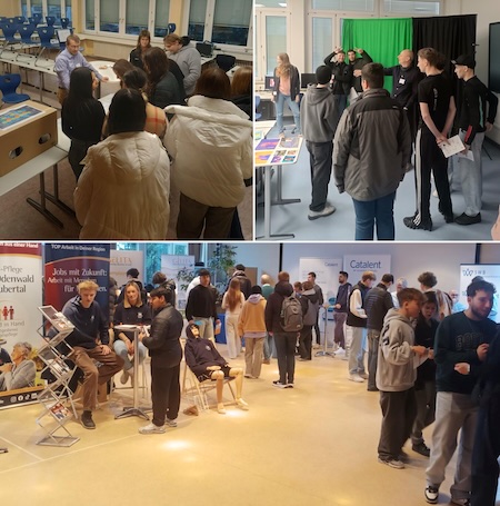 Zusätzlich präsentierten zahlreiche Unternehmen und Institutionen aus der Region – darunter Catalent, Asteelflash, DILO KG, Gelita AG und die Sozialstation Eberbach – ihre Ausbildungs- und Karrieremöglichkeiten auf einer Ausbildungsmesse in der Aula und Cafeteria der Schule. Schülerinnen und Schüler hatten die Chance, direkt mit den Unternehmen in Kontakt zu treten, sich über Praktikumsangebote zu informieren und sogar erste Schritte für ihre berufliche Zukunft zu planen. Auch viele TFS-Schülerinnen und Schüler nutzten die Messe, um sich gezielt über ihre Optionen nach dem Schulabschluss zu informieren.