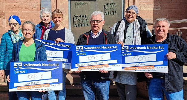 Zum Verkauf in der Vorweihnachtszeit im katholischen Pfarrheim in der Feuergrabengasse wurden unter anderem Handarbeiten und viele Deko-Artikel angeboten. Gestern konnten Hauptorganisatorin Elisabeth Draxler und ihre aktive Kreativwerkstatt-Kollegin Christiane Hofmann aus dem Reinerlös dieser Veranstaltung insgesamt 4.000 Euro an Eberbacher Einrichtungen übergeben. Jeweils 1.000 Euro erhielten Büsra Isik und Curd Walschburger für den AWO-Laden in Eberbach-Nord, Diakon Joachim Szendzielorz als Vertreter der Karitativen Dienste St. Elisabeth, Ulrike Riedl für den Verein “Hände für Kenia†und erstmals Rebecca Knapp-Leitloff vom Förderverein der Dr.-Weiss-Grundschule.