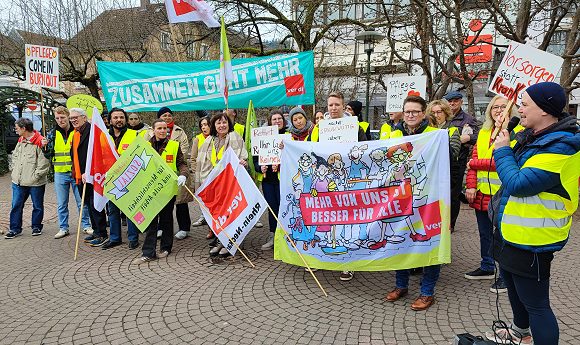 Die Vereinte Dienstleistungsgewerkschaft (ver.di) hatte die BeschĂ€ftigten der GRN-Klinik in Eberbach erstmals in deren Geschichte zu einem ganztĂ€gigen Warnstreik aufgerufen. âDer Arbeitgeberverband mauert sich bei den Tarifverhandlungen des öffentlichen Dienstes ein. Auch in der zweiten Verhandlungsrunde haben sie ein Angebot verweigert. Darauf geben die BeschĂ€ftigten mit bundesweiten Warnstreiks die einzig richtige Antwortâ, erklĂ€rte Monika Neuner von ver.di Rhein-Neckar. âDie BeschĂ€ftigten der KrankenhĂ€user arbeiten jeden Tag an der Belastungsgrenze und oft darüber hinaus. Vor diesem Hintergrund sind Arbeitgeberfantasien über eine Nullrunde oder einen Tarifvertrag mit extrem langer Laufzeit ein Affront und Ausdruck massiv fehlender WertschĂ€tzungâ.