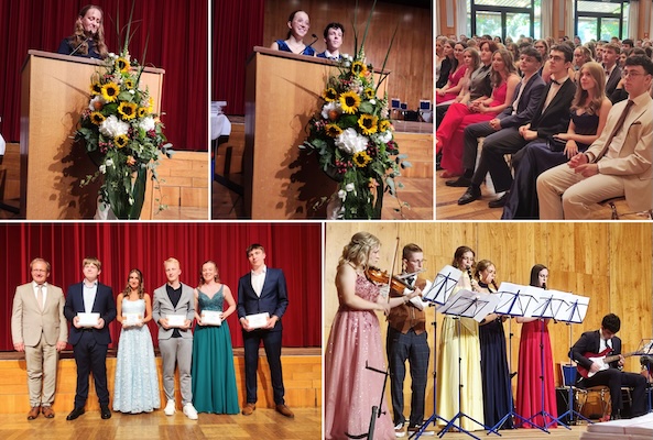 Weitere Redebeiträge kamen von den Lehrern Mathias Berstel und Johannes Ferencik, für die Eltern sprach Stefanie Dengel, für den Elternbeirat Tobias Pröll und für die SMV Marline May und Clemens Williams. Traditionell hielt die Ansprache für die Schülerinnen und Schüler die diesjährige Scheffelpreisträgerin Sophie Maier, bei der damit „ein Traum ihres schreibfreudigen jüngeren Ichs in Erfüllung gegangen ist“. Musikalisch gestaltet wurde die Feier von der Big Band der Schule, dem Basiskurs Musik, dem Abi-Ensemble und dem Chor aller Abis, jeweils unter der Leitung von Jutta Gewahl.