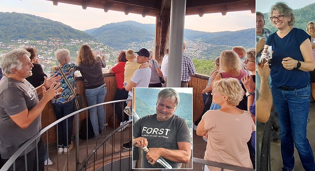 Genau 61 Termine absolvierte der Förster in acht Jahren auf dem Turm, im Sommer mittwochs um 17 Uhr, kostenlos und ohne Anmeldung. An den sieben Turmtreffs in diesem Jahr nahmen etwas mehr als 100 Gäste teil. Zum Finale ließ Richter die Korken knallen und gab eine Runde Sekt aus (kleines Bild).