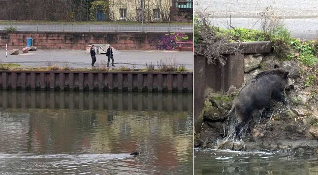 Ein Schwarzkittel durchquerte den Fluss auf Höhe des Bootshauses der Rudergesellschaft (RGE). An deren Bootssteg auf dem südlichen Flussufer sprang das Tier in die Fluten und schwamm über den Neckar mit einer versierten stilistischen Mischung aus Brust- und Kraulbewegungen. Am Ende der Spundwand des Neckarlauers, oberhalb des ehemaligen Kies-Umschlagplatzes, gelangte es schließlich wieder an Land und machte sich auf dem Grünstreifen unterhalb der B 37 in Richtung Lindach davon.