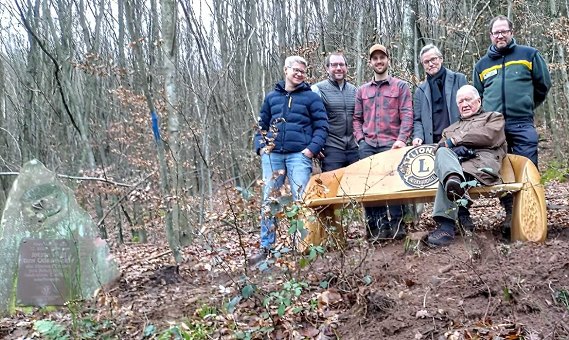 Platz zum Verweilen am Wolfsstein Die neue Lions-Bank am Wolfsstein, v.l. Dr. Ulrich Bennemann, Initiator Tobias Kuhlmann, Motorsägenkünstler Micha Reichert, Lions-Präsident Prof. Dr. Stefan Leukel, Urs Nedbal (sitzend) und Stadtförster Joachim Maier. (Foto:privat)(hr) (mg) Anlässlich des 25-jährigen Jubiläums des Wolfssteins hat der Lions-Club Eberbach am Denkmal für den letzten Wolf im Odenwald eine Sitzbank gestiftet.