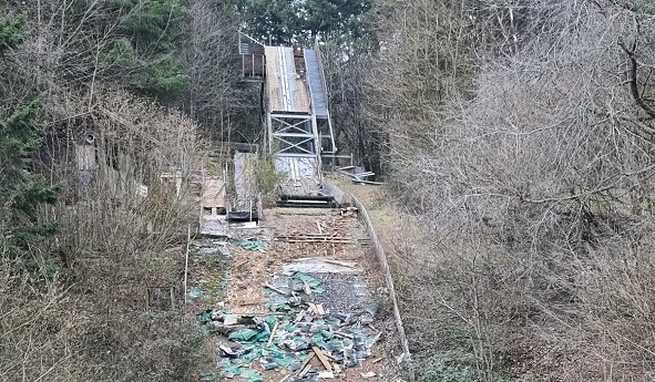 Skisprung-Ära endet nach 75 Jahren - Stahlturm soll bleiben (Foto: Hubert Richter)(hr) Seit 1950 gab es am Katzenbuckel Skisprungschanzen. Zuletzt war es eine Mattenschanze für Ganzjahresbetrieb, die im Mai 1995 durch die “Skizunft Katzenbuckel Eberbach†am höchsten Berg des Odenwalds eingeweiht wurde. Nun wird das Bauwerk abgerissen.