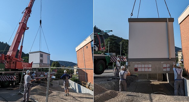 Das rund 24 Tonnen schwere Fertiggebäude wurde per Tieflader angeliefert. Ein Kranwagen der Firma Scholl hievte die an vier Ketten hängende Station präzise auf das vorbereitete Fundament. Der Fahrzeugverkehr in der Pestalozzistraße wurde einspurig an der Baustelle vorbei geleitet.