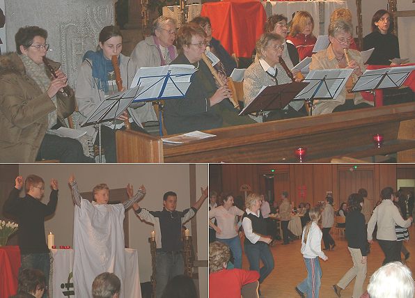 Lasst uns Licht sein - Eberbacher Frauen luden ein Eine Musikgruppe aus dem Vorbereitungsteam unter der Leitung von Tabea Langenbach sorgte für die musikalische Untermalung des Gottesdienstes. Mitglieder der Konfirmandengruppe (u.l.), Polnischer Volkstanz beim anschließenden gemütlichen Beisammensein im Katholischen Pfarrheim. (Fotos:Wörner)(tw) Mit einer Gebetsordnung, die in diesem Jahr von Frauen aus Polen erstellt wurde, feierten am Freitagabend Gemeindemitglieder der Eberbacher katholischen und evangelischen Gemeinden in der Kirche St. Johannes Nepomuk mit einem ökumenischen Gottesdienst den Weltgebetstag der Frauen. Dieser wird alljährlich am ersten Freitag im März weltweit von allen Konfessionen gefeiert. Am Eingang der Kirche wurde nach polnischem Brauch Salz und Brot gereicht. Mit dem polnischen Segenswunsch "Szczesc Boze" (Gott segne dich) begrüßte Pastoralreferentin Sabine Bohnert die zahlreichen Besucher, und forderte alle dazu auf die jeweiligen Sitznachbarn ebenso zu begrüßen. Ein Vorbereitungsteam um Pfarrerin Sabine König und Pastoralreferentin Sabine Bohnert hatte die Feier vorbereitet und sich mit Polen als zentralem Thema des Gottesdienstes näher auseinandergesetzt. In einem Diavortrag wurden Land, Leute und Geschichte Polens den Gebetstagteilnehmern näher gebracht. Die Lesungen wurden von einem aus Polen stammenden Gemeindemitglied in polnischer Sprache vorgetragen und dann in deutscher Sprache wiederholt. Erstmals waren auch Konfirmand/innen beim Weltgebetstagsteam dabei. In einem Anspiel unter der Regie von Barbara Bart erzählten sie vom an Aussatz erkrankten Feldherrn Naaman. In der Geschichte aus dem 2. Buch der Könige wird erzählt wie eine israelitische Sklavin wieder Licht und Hoffnung in dessen Leben brachte und er schließlich geheilt wurde. Bei der Kollekte zugunsten von Frauenprojekten in der ganzen Welt wurden am Freitag über 500 Euro gesammelt. Im Jahr 2003 wurden mit solchen Spendengeldern 268 Projekte in 80 Ländern unterstützt. Zum Schluss wurde für jeden Besucher ein kleines Licht in der Landesfarbe Polens entzündet, ein Andenken zum mitnehmen. Im Anschluss an den Gottesdienst traf man sich zu Tee, Kuchen und Unterhaltung im katholischen Pfarrheim.