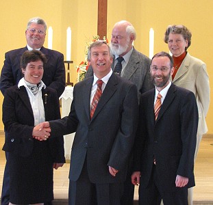 Unser BIld zeigt Rudi Kößler (Mitte) bei seiner Verabschiedung mit Dekanin Hiltrud Schneider-Cimbal (vorne l.) und Pfarrer Ekkehard Leytz (vorne r.) sowie den Mitgliedern des Kirchengemeinderats Karlfrieder Peters, Johannes Neth und Dr. Ingrid Ebschner (hinten v.l.).