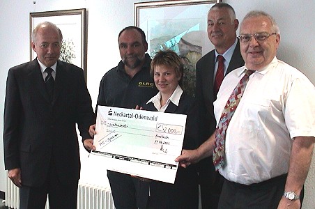 Sparkasse beschenkt gemeinnützige Organisationen V.l. Wolfgang Kleeberger, Heinz Thöne, Edeltraud Gutsch, Klaus Poser und Dr. Fred Adelmann bei der symbolischen Scheckübergabe. (Foto:C.Richter)(cr) In Zeiten knapper Kassen gab es für drei ehrenamtlich arbeitende Einrichtungen eine besondere Freude: Sparkassendirektor Wolfgang Kleeberger und Regionalleiter Klaus Poser konnten gestern mit insgesamt 2000 Euro die DLRG Eberbach, die Odenwaldhilfe für Tschernobyl-Kinder (OTK) und den DRK Ortsverband Waldbrunn überraschen. Dieser Betrag ist der Erlös aus dem diesjährigen PS-Sparen und Gewinnen. Zahlreiche Sparkassenkunden unterstützen schon jahrzehntelang durch dieses Lotteriesparen indirekt gemeinnützige, kulturelle und soziale Einrichtungen, denn von jedem Los, das sie pro Monat kaufen, wandert ein Euro in einen Topf, der jährlich ausgeschüttet wird. Für die DLRG nahm gestern Heinz Thöne und für die OTK Dr. Fred Adelmann je 500 Euro entgegen. Letzterer wird das Geld für die Tschernobyl-Kinder einsetzen, die am 17. Juli wieder ihre Sommerferien in Eberbach verbringen dürfen. Über 1000 Euro freut sich Edeltraud Gutsch, DRK Ortsverband Waldbrunn. Mit diesem Geld soll ein Defibrillator für die Waldbrunner Ortsgruppe beschafft werden. "Wir wurden in die ´Helfer-vor-Ort-Schleife´ miteinbezogen" so Gutsch, was bedeutet, dass sie oft als Erste am Unfallort sind. Ein solches Gerät sei äußerst wichtig, um Leben zu retten.