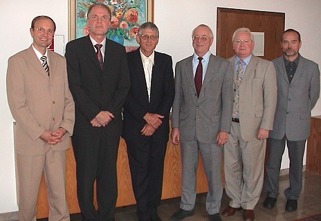 Chefarztwechsel im Eberbacher Krankenhaus V.l. Verwaltungschef Martin Hildenbrand, Dr. Johannes Berentelg, Dr. Wulf Thomsen, Dr. Bodo-Falk Hoffmann, Klaus Eiermann und der Leitende Krankenhausarzt Dr. Helmut Reinhard. (Foto:C.Richter)(cr) Gleich zwei Gründe zum Feiern gab es im Eberbacher Kreiskrankenhaus: Zum einen konnte der Chefarzt der inneren Abteilung, Dr. Wulf Thomsen, gestern nach 18 1/2 Jahren Abteilungsleitung in den Ruhestand verabschiedet werden, gleichzeitig wurde sein Nachfolger Dr. Johannes Berentelg offiziell als neuer Chefarzt der Abteilung eingeführt.