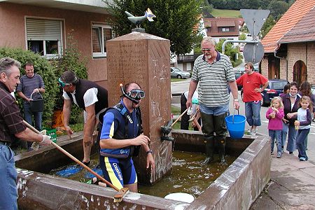 Eberbacher und Wimmersbacher Narren als Brunnenputzer aktiv Nach der "Grunduntersuchung" konnte der Schrubber gefahrlos angesetzt werden (Foto:Claussen)(jc) Natürlich nicht ganz ohne humoristische Einlagen konnte die heutige gemeinsame Brunnenputzaktion der KG Urmel und der KG Kuckuck am Kuckucksbrunnen abgehen. Nach einer "Grunduntersuchung" mit Taucherausrüstung gingen die Brunnenpaten mit Chlorreiniger und Schrubber ans Werk und brachten die Wasserstelle auf zunächst Hochglanz und im Anschluss auch wieder zum sprudeln. Der Vorsitzende des Bürger- und Heimatvereins, Günter Lipski war ebenfalls gekommen, um den beiden Vereinen seinen Dank für die Übernahme der Patenschaft auszusprechen und der Einlösung einer Wettschuld beizuwohnen. Der Wirt des Gasthauses Linde hatte es nicht glauben wollen, dass der Bürger- und Heimatvereins es schafft, die Stadt davon zu überzeugen, dass der Brunnen im Dr. Mantelweg, wie die Brunnen in der Stadt auch, wieder laufen sollte. Lipski hatte zwei Kasten Bier dagegen gesetzt und die Wette gewonnen. Der Gerstensaft wurde beim Grillen an Ort und Stelle gleich verkostet.