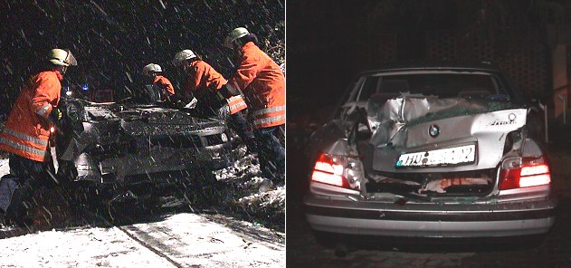 Audi kam von der Straße ab - zweimal Totalschaden Die Feuerwehr Eberbach bei der Bergung des Audi-Wracks. Rechts der im Carport abgestellte BMW. (Fotos:Richter)(hr) Rund 30.000 Euro Sachschaden verursachte ein bisher nicht ermittelter Autofahrer heute Morgen gegen 5 Uhr bei einem Unfall auf der Landesstraße 524. Er war mit seinem Audi in Richtung Waldbrunn unterwegs, als er im Bereich des Eberbacher Ortsausgangs in einer leichten Linkskurve von der Fahrbahn abkam, die Böschung hinabrutsche, sich aufs Dach drehte und ins Heck eines BMW krachte, der im Carport eines privaten Anwesens abgestellt war. Dabei schob der Audi den BMW noch durch eine Sandsteinumfassung. An beiden Autos entstand Totalschaden. Von dem Fahrer bzw. den Insassen des Audi fehlte zum Zeitpunkt der Unfallaufnahme jede Spur. Die Polizei vermutet Unfallflucht. Zeugen, die verdächtige Wahrnehmungen gemacht haben, werden gebeten sich mit der Polizei unter Tel. (06271) 92100 in Verbindung zu setzen.