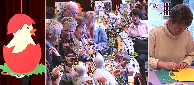 Frühlingsstimmung in der Eberbacher Stadthalle Reger Betrieb herrschte heute Morgen schon an den Ständen. Rechts "Fensterbildnerin" Brunhild Schlögl bei der Arbeit. (Fotos:C.Richter)(cr) Wer sich trotz des tristen Wetters auf den wirklichen Frühling einstimmen möchte, kommt heute und morgen in der Stadthalle in Eberbach auf seine Kosten: Pünktlich um 10 Uhr öffnete der Eberbacher Ostereiermarkt seine Pforten. Ursula Sigmund vom Bürger- und Heimatverein konnte über 50 regionale und überregionale Aussteller nach Eberbach holen, die heute und morgen Kunsthandwerkliches rund um Ostern und den Frühling anbieten. Hasen, Hühner und Eier in allen Variationen werden ebenso zum Kauf angeboten wie Kerzen oder filigrane Arbeiten aus Tonpapier und Fotokarton. Beispielsweise von Brunhild Schlögl aus Hartheim. Sie ist schon seit über einem Jahrzehnt immer wieder in Eberbach, um ihre von Hand gearbeiteten Fensterbilder zu verkaufen. Ihr darf man bei der kniffeligen Arbeit an ihrem Stand "auf die Finger schauen". Auch Dekoartikel aus Ton oder Holz sind im Großen Saal zu bewundern und natürlich zu kaufen.