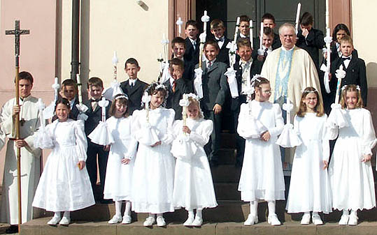 Zum ersten Mal am Mahl Gottes teilgenommen Zum ersten Mal am Mahl Gottes durften heute 22 Mädchen und Jungen in der kath. Pfarrkirche St. Maria in Waldbrunn teilnehmen. Das Foto zeigt sie zusammen mit Pater Kasimir Fieden. (Foto: Baumgartner)(tb) Feierlich beging man heute in der kath. Pfarrkirche St. Maria in Waldbrunn - wie in vielen katholischen Kirchengemeinden auch - den Weißen Sonntag. Insgesamt waren 22 Jungen und Mädchen aus Waldbrunn zu ihrer ersten Teilnahme am Mahl Gottes eingeladen. Monatelang hatten sich die Kommunionkinder mit ihren Kommuniongruppenleitern und Pater Kasimir Fieden auf das Sakrament der Eucharistie vorbereitet. So konnten die Kommunionkinder es kaum erwarten, bis sie an "ihrem" Sonntag zusammen mit Pater Kasimir Fieden feierlich in die Pfarrkirche St. Maria einziehen konnten. Der Gottesdienst zur diesjährigen Erstkommunion stand unter dem Motto "Jesus unter uns", welches auch vor dem Altar versinnbildlicht wurde.