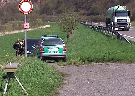 Allerdings sei nicht das Abkassieren der Zweck dieser Polizeiaktionen, sondern das Gespräch mit den Verkehrssündern. Erich Lindenthal, Leiter des Polizeireviers Eberbach, und Peter Dabitsch von der Verkehrspolizei Heidelberg waren heute wieder zusammen mit vier weiteren Beamten in Eberbach aktiv und mussten zahlreiche Verkehrssünder zu vernünftiger Fahrweise ermahnen. Mit diesen Gesprächen hoffen die Beamten, schweren Verkehrsunfällen vorzubeugen. Mit einem ESO-Einseitensensor-Gerät können im Halbsekundentakt die vorbeifahrenden Fahrzeuge gemessen weden. Heute wurden insgesamt 1.419 Fahrzeuge gemessen, 41 davon sind zu schnell durch die Messstation gefahren.