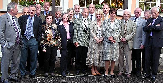 Unser Bild zeigt v.l.: Dr. Harro Träubel, Hans Hutfleß, Dr. Horst Stumpf, Wilfried Wieder, Bruno Schmitt, Ruth Trauth (geb. Keil), Maria Eder, Brigitte Träubel (geb. Ischar), Erika Ellis (geb. Fischer), Dr. Reimar Frisch, Dr. Arnd Westernacher, Peter Mayer, Evi Bürgel (geb. Hiersemann), Dr. Heinz Friedrich, Elisabeth Hahn (geb. Gaedeke), Ortwin Pscheidt, Robert Moray, Dr. Hans-Ulrich Drüner, Dr. Hermann Krug. Nicht auf dem Bild, weil erst am Sonntag dazu gestoßen, ist Dr. Werner Thomas.