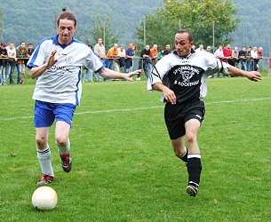 Zwei Treffer nach dem gleichen Strickmuster entscheiden Nur ein Tor gelang Murat Sahin gegen seine ehemaligen Mannschaftskollegen. Ansonsten hatte ihn Rockenau, hier mit Daniel Schüssler, gut im Griff und gewann 3:2.(Foto: Menges)