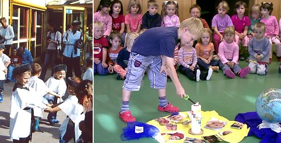 Das Bilderbuch "Die bunte Flaschenpost" faszinierte die Kinder so sehr, dass man es als Grundlage für den "Kindergarten-Weltkindertag" einsetzte. Die Geschichte handelt von einem Jungen, der mit seinem Vater auf einer kleinen Insel lebt, sich oft sehr einsam fühlt und sich nichts sehnlicher wünscht als einen Freund. Da kommt ihm eine Idee: Er schreibt in seiner schönsten Schrift: "Wer will mein Freund sein?" Seinen Brief schickt er als Flaschenpost auf die Welt-Meeresreise. Die Flasche schwimmt nach Afrika, Italien, Russland, Türkei und Deutschland, und überall findet der Inseljunge Freunde, die sich auf das Blatt dazu malen und die Flaschenpost wieder weit ins Meer werfen. Und die Flasche kommt tatsächlich wieder bei Simon auf der kleinen Insel an. Der ist außer sich vor Freude, denn nun ist er nicht mehr allein. Er hat Freunde auf der ganzen Welt.