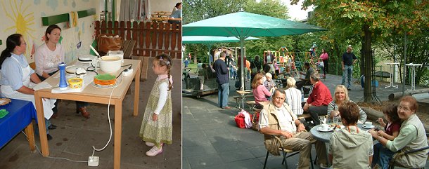 Am Nachmittag stand dann der Kindergarten als Ort der Begegnung im Mittelpunkt. Während die Kinder sich im Spielezimmer, Kreativraum oder im Hof ausprobieren und austoben konnten, hatten die Eltern und alle anderen zahlreichen Gäste die Möglichkeit, sich in der Einrichtung umzusehen und sich über die Arbeit und einige Projekte des Kindergartens zu informieren. Außerdem luden ein reichhaltiges Kuchenbuffet, frisch gebackene Waffeln, Neuer Wein und Zwiebelkuchen zur Stärkung ein.