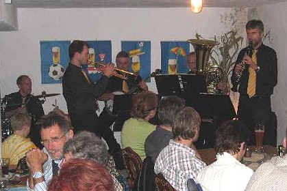 Leckerbissen für Freunde des Unverfälschten (Foto:Johe)(hr) (ra) Per Automobil hatten zahlreiche Neckartaler die Höhen des Odenwalds bewältigt und füllten die Herzog-Wilhelm-Stube der Beerfeldener Privatbrauerei Felsenkeller gestern Vormittag bis zum Bersten. Mit heißem New Orleans und Dixieland machte die Oldtime-Jazz-Connection das Gastspiel der Eberbacher Jazztage zum Leckerbissen für alle Freunde des Urigen und Unverfälschten.