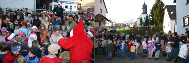 Nikolaus kam zu Moosbrunner Kindern Der Nikolaus kam auch zu den Moosbrunner Kindern, die gerne seinen Sack plünderten. (Fotos: Böhm)(ub) (mjb) Der Moosbrunner Weihnachtsmarkt am 1. Adventssonntag lockte wieder zahlreiche Besucher aus Schönbrunn und den umliegenden Gemeinden an. Für den Nachmittag hatte sich der Nikolaus angesagt, um die Kleinen zu beschenken. Nach den Klängen der Musikkapelle "Kleiner Odenwald" aus Allemühl unter der Leitung von Jürgen Konrad sangen die Kindergartenkinder mit ihren Erzieherinnen Nikolaus- und Adventslieder. Trotz des sehnsüchtig gesungenen "Sei gegrüßt, lieber Nikolaus!" ließ sich der Bote der Vorweihnachtszeit nicht aus der Ruhe bringen und besuchte mit seinem Gehilfen zunächst noch die auf seinem Weg liegenden Stände. Dann aber kamen die beiden, für das fast frühlingshafte Wetter viel zu warm gekleideten Herren gehörig ins Schwitzen, denn die Zahl der kleinen Hände, die sich nach den Päckchen aus dem großen Sack reckten, schien keine Ende zu nehmen.