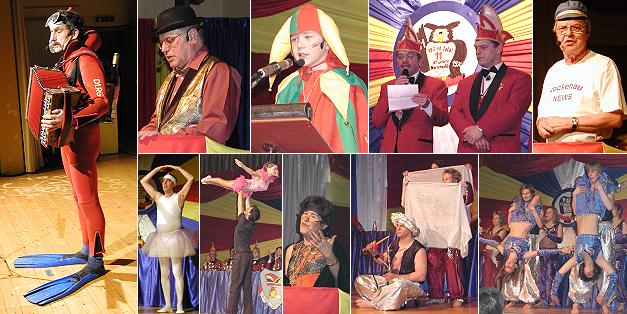 Erste Sitzung beim Club Eulenspiegel Links: Johann Bachl, oben v.l. Ernst Sraub, Lars Hormann, Sitzungspräsident Roman Krawczyk und Elferrat Uwe Dörfer, Heinz Jung, unten v.l. Roland Schneider vom Männerballett, die Sportakrobaten Steffen Krumpf und Ann-Kathrin Wiegel, Hiltrud Schneider-Cimbal und die "Flames". (Fotos:Claussen)