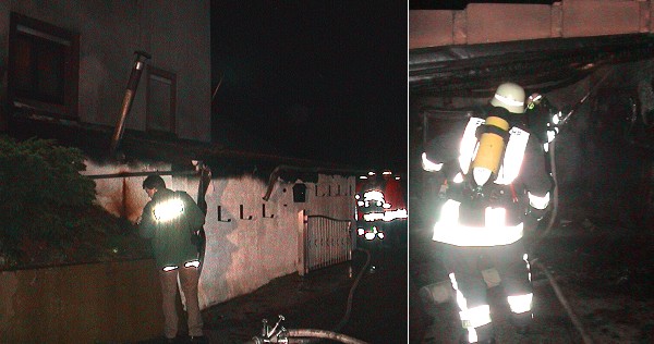 Schutt und Asche statt saftigen Schinken (Fotos:Richter)(hr) Aus einer an ein Wohnhaus angebauten Garage im Eberbacher Ortsteil Brombach schlugen heute Abend gegen 20 Uhr meterhohe Flammen. Die starke Rauchentwicklung im Oberdorf war weithin sichtbar. Die sofort alarmierte Brombacher Ortsteilwehr konnte zusammen mit der hinzugezogenen Hirschhorner Feuerwehr ein Übergreifen des Feuers auf das Wohnhaus verhindern und den Brand rasch löschen. Auch die Abteilung Stadt der Eberbacher Feuerwehr rückte mit mehreren Fahrzeugen aus, musste aber nicht eingreifen.