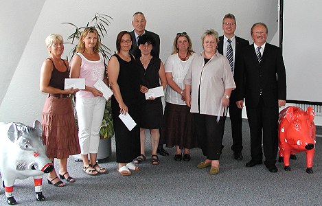 (jc) (sno) Viele Sparkassen-Kunden machen beim Lotteriesparen "Spielend sparen und gewinnen" mit, sparen pro Los vier Euro an und unterstützen mit ihrem Einsatz von nur einem Euro pro Los im Monat indirekt gemeinnützige, kulturelle und soziale Einrichtungen in der Region. Zur Freude am Sparen kann noch das Losglück hinzukommen. Denn für die Teilnehmer sind Gewinne bis zu 5000 Euro jeden Monat möglich, bei der Jahresauslosung sogar 10.000 Euro. Aus dem Lotterie-Reinertrag der Sparkasse Neckartal-Odenwald des Jahres 2006 in Höhe von insgesamt rund 15.000 Euro wurde der anteilige Betrag für den Regionalmarkt Eberbach, 2500 Euro, vom Vorstandsvorsitzenden, Sparkassendirektor Gerhard Stock, im Beisein von beiden Regionaldirektoren Klaus Poser und Karlheinz Emig in diesem Jahr an die Vertreterinnen der Eberbacher Kindergärten überreicht. Der flächenübergreifende Wettbewerb "Jugend musiziert" wurde zu einem früheren Zeitpunkt ebenfalls unterstützt.