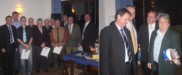 Langjährige Mitglieder wurden geehrt (Fotos: privat)(bro) (bl) Im Rahmen der diesjährige Weihnachtsfeier des VfB Eberbach wurden wieder zahlreiche Ehrungen vom ersten Vorsitzenden Joachim Scheible vorgenommen. Für 25-jährige Mitgliedschaft wurden mit der silbernen Ehrennadel Klaus Münch und Volker Wäsch ausgezeichnet. Die goldenen Ehrennadel für 40-jährige Mitgliedschaft erhielten Ferdinand Mohr, Wolfgang Winkler, Hans Nava, Karl Müller und Ferdinand Riedinger. Seit 60 Jahren halten Heinz Zelenka, Martin Riedl und Otto Wäsch dem VfB die Treue. Sie erhielten eine Ehrenurkunde. Für seine Verdienste um den Verein erhielt noch das ehemalige Vorstandsmitglied Horst Hagendorn einen in den Vereinsfarben bemalten Miniatureber.