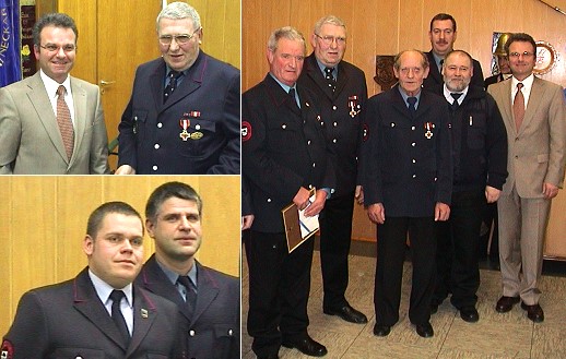 Kommandant und Stellvertreter wiedergewählt Bürgermeister Bernhard Martin und Lothar Zimmermann (links oben, v.l.), darunter die neuen Brandmeister Marco Bräutigam und Patrick Laick, rechtes Bild v.l. Berthold Scheuermann, Lothar Zimmermann, Gerhard Böhnig, Ralf Böhm, Jörg Kubein und Bernhard Martin. (Fotos:Richter)(hr) Für weitere fünf Jahre wählte heute Abend die Freiwillige Feuerwehr Eberbach bei ihrer Jahreshauptversammlung Jörg Kubein zu ihrem Gesamtkommandanten. Kubein hat diese Funktion seit 16. Januar 1998 inne. Bereits am vergangenen Dienstag war Kubein als Kommandant der Abteilung Stadt wiedergewählt worden. Ebenso im Amt bestätigt wurde heute Ralf Böhm aus Friedrichsdorf als stellvertretender Gesamtkommandant für die nächsten fünf Jahre.