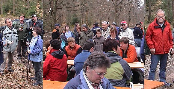 Sehenswürdigkeiten entlang der Landesgrenze erkundet Links Bürgermeister Egon Scheuermann im Gespräch mit seiner Mitarbeiterin Birgit Schäfer, in der Mitte die "Grenzgänger" bei der Rast an der Eberbacher "Spitzhuthütte", rechts Ehrenbürgermeister Manfred Heiss. (Fotos:C.Richter)(cr) Zu ihrem schon traditionellen Gemarkungsrundgang waren heute rund 50 Sensbachtaler Bürgerinnen und Bürger, Mitglieder des Gemeindevorstandes und der Gemeindevertretung, sowie Bürgermeister Egon Scheuermann und Ehrenbürgermeister Manfred Heiss unterwegs.