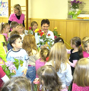 Zu einer kleinen Überraschungs-Abschiedsfeier mit anschließendem Umtrunk hatte das Kindergartenteam eingeladen. Der Kindergartenbeauftragte Reinhard würdigte im Namen des Trägers mit einem Blumenpräsent die Treue zur Einrichtung, die geleistet Arbeit und den unermüdlichen Einsatz.